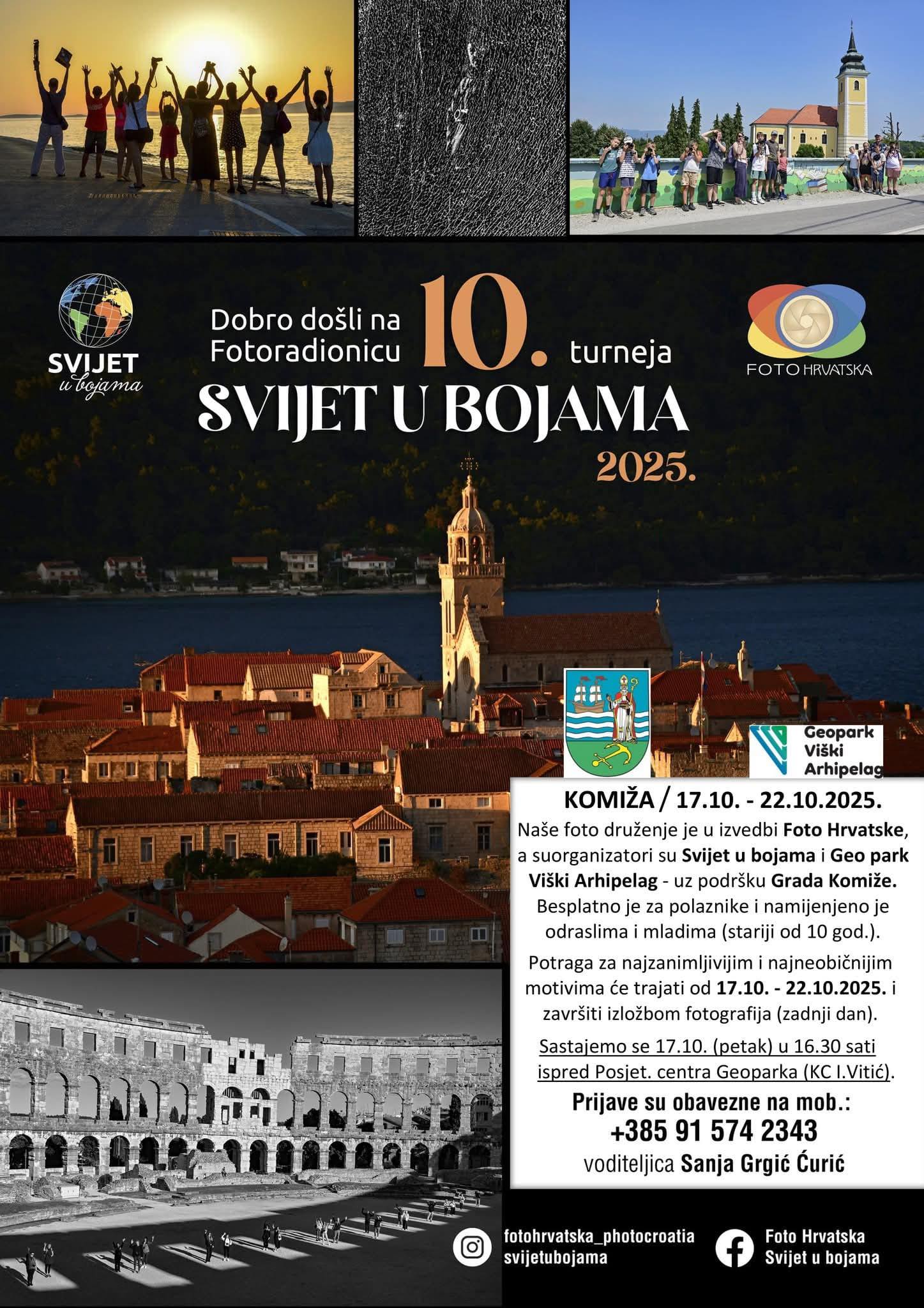 Komiža će od 17. do 22. listopada 2025. ugostiti 10. turneju fotoradionice “Svijet u bojama”, u organizaciji Foto Hrvatske, suorganizaciji s Geoparkom Viški arhipelagom te uz podršku Grada Komiže.